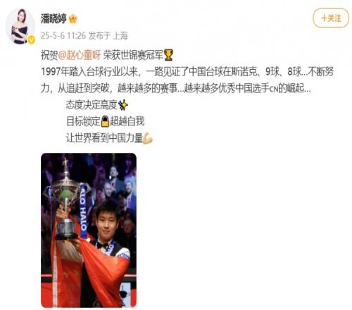 中國“九球天后”潘曉婷更新了社媒,對趙心童表達了祝賀。潘曉婷寫道:祝賀趙心童榮獲世錦賽冠軍,1997年踏入臺球行業(yè)以來,一路見證了中國臺球在斯諾克、9球、8球…不斷努力,從追趕到突破,越來越多的賽事…越來越多優(yōu)秀中國選手