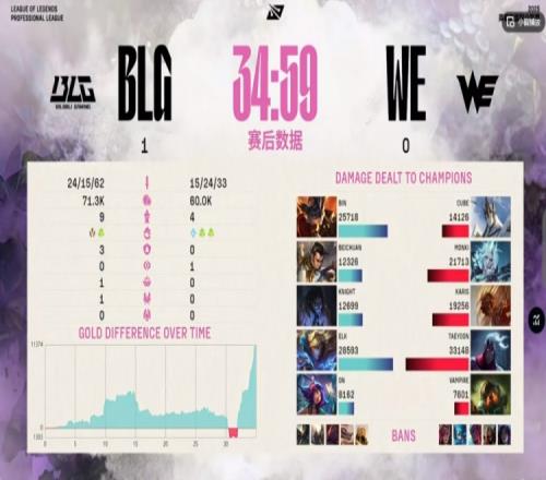 首局比賽BLG前期瘋狂進(jìn)攻,節(jié)奏不斷,WE想接團(tuán)越接越虧,10分鐘BLG就拿下了快4K的經(jīng)濟(jì)優(yōu)勢(shì),甚至打出了戰(zhàn)略點(diǎn)!但是隨后ON妮蔻帶頭,WE頻繁抓單逮捕BLG落單的人,打回經(jīng)濟(jì)差還能控龍給壓力!中期做視野的ON妮蔻連續(xù)被秒,WE一波回馬槍打出0換3之后拆掉中路高地,經(jīng)濟(jì)反超!但是WE想一波又撤了埋了伏筆!BLG大劣勢(shì)下大龍逼團(tuán),依靠幾位明星選手拼操作打出完美團(tuán),0換5團(tuán)滅WE拿下大龍?jiān)侔丫謩?shì)打回!隨后的龍魂團(tuán)ON妮蔻先倒,但是knight塞拉斯偷到泰坦大配合隊(duì)友秒掉了Monki佛耶戈之后趁勢(shì)追擊,BLG連續(xù)第二次團(tuán)滅WE,從下路一波結(jié)束比賽!