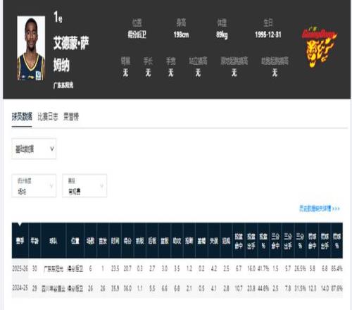 廣東男籃是CBA聯(lián)盟為數(shù)不多的以本土后場組合為首發(fā)的球隊(duì)。杜鋒本賽季的常規(guī)安排就是徐杰、胡明軒首發(fā),小外薩姆納第六人。本賽季6場過后,薩姆納僅1場獲得首發(fā)機(jī)會。