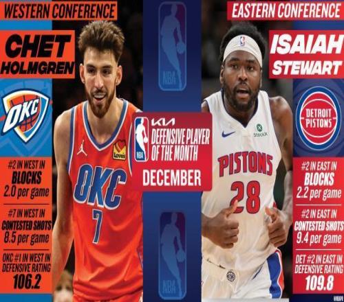 12月場均2.2蓋帽(東部第二),場均9.4次干擾投籃(東部第二),活塞防守效率東部第二(109.8)。